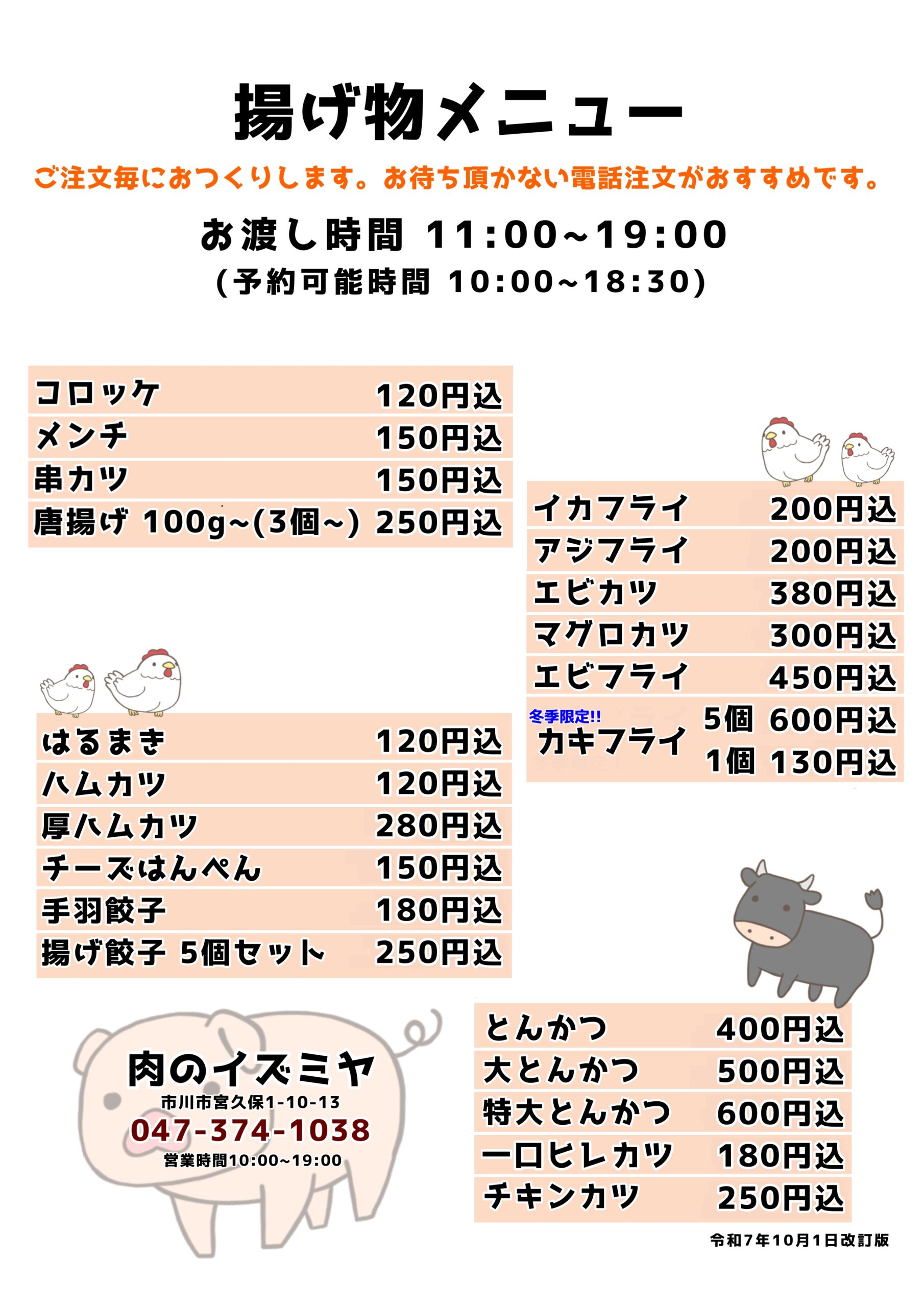 揚げ物受付 11:00〜19:00 (ご予約は10:00~可能です)